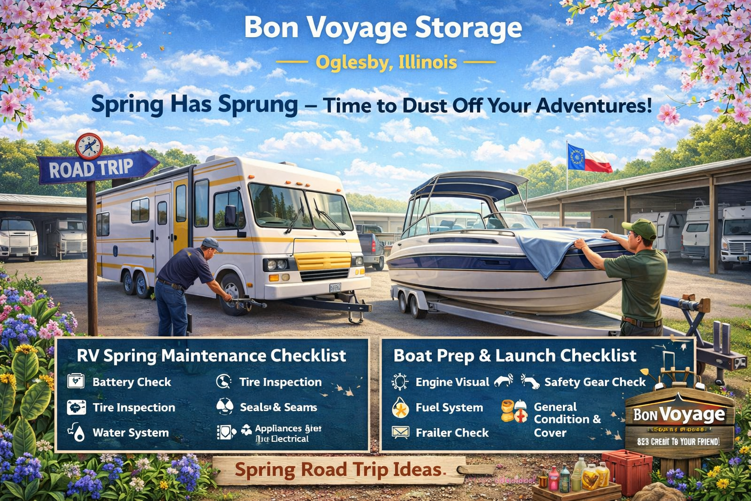 Hello Bon Voyage family! Spring is officially here, which means it’s time to wake up your RV, prep your boat, and plan those adventures you’ve been dreaming about all winter. We put together this little guide to help you get ready — because we care about you. Also because we’re nosy and want to know where you’re going. 😄